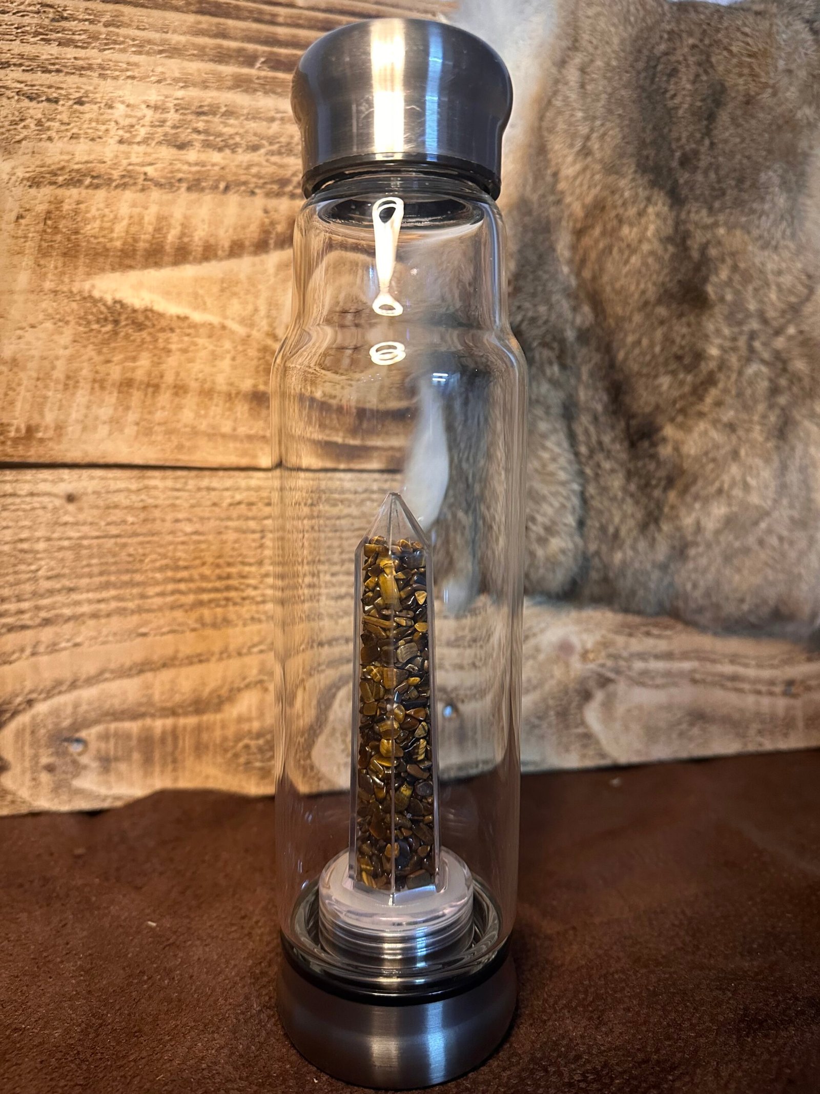 Material: Botella con minerales de ojo de tigre natural