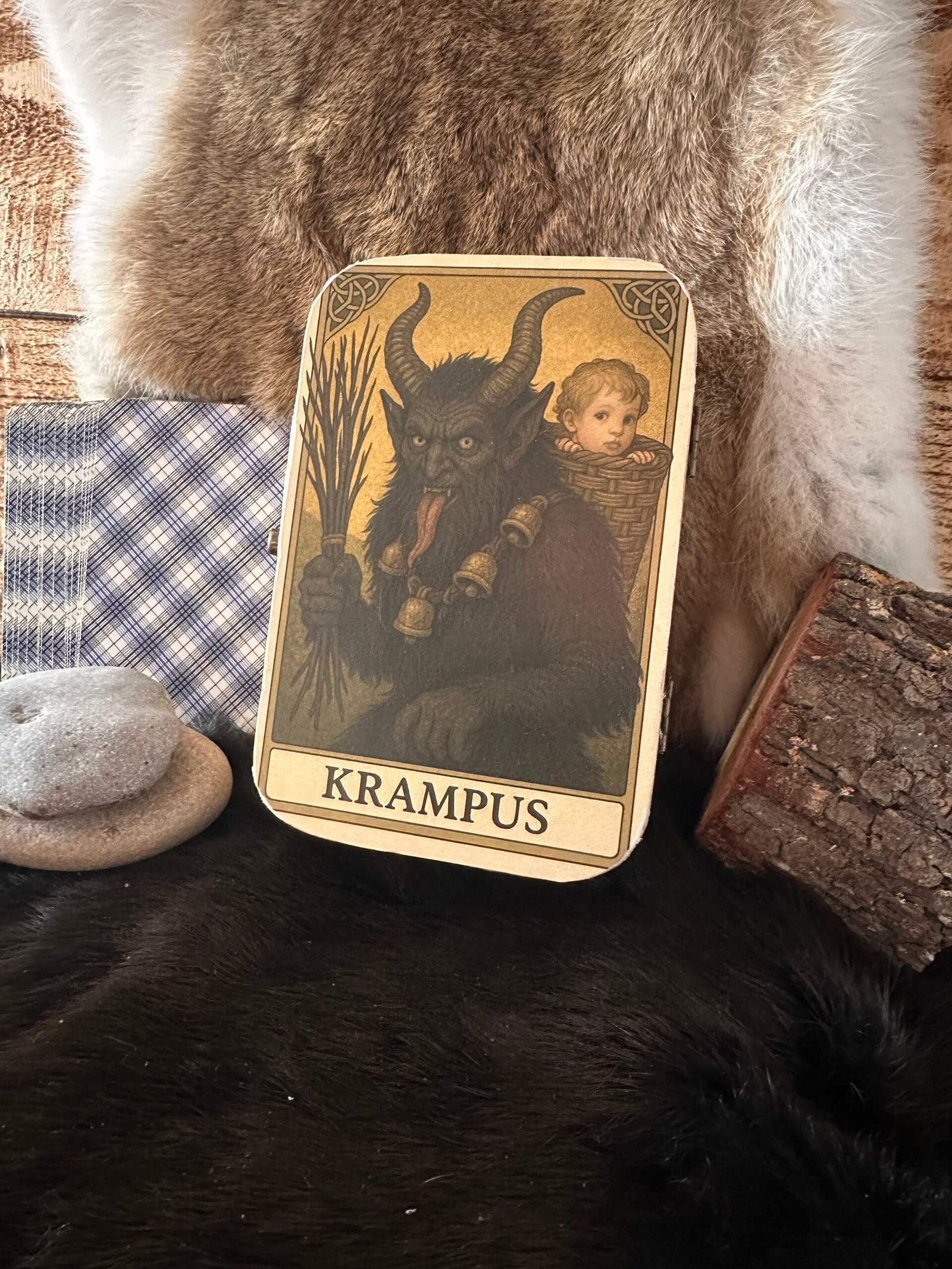 El diseño inspirado en Krampus, figura ligada a lo instintivo, lo oculto y la confrontación con la sombra, convierte esta caja en una opción ideal para barajas intensas, lecturas profundas o espacios de trabajo espiritual con una estética más cruda y directa.