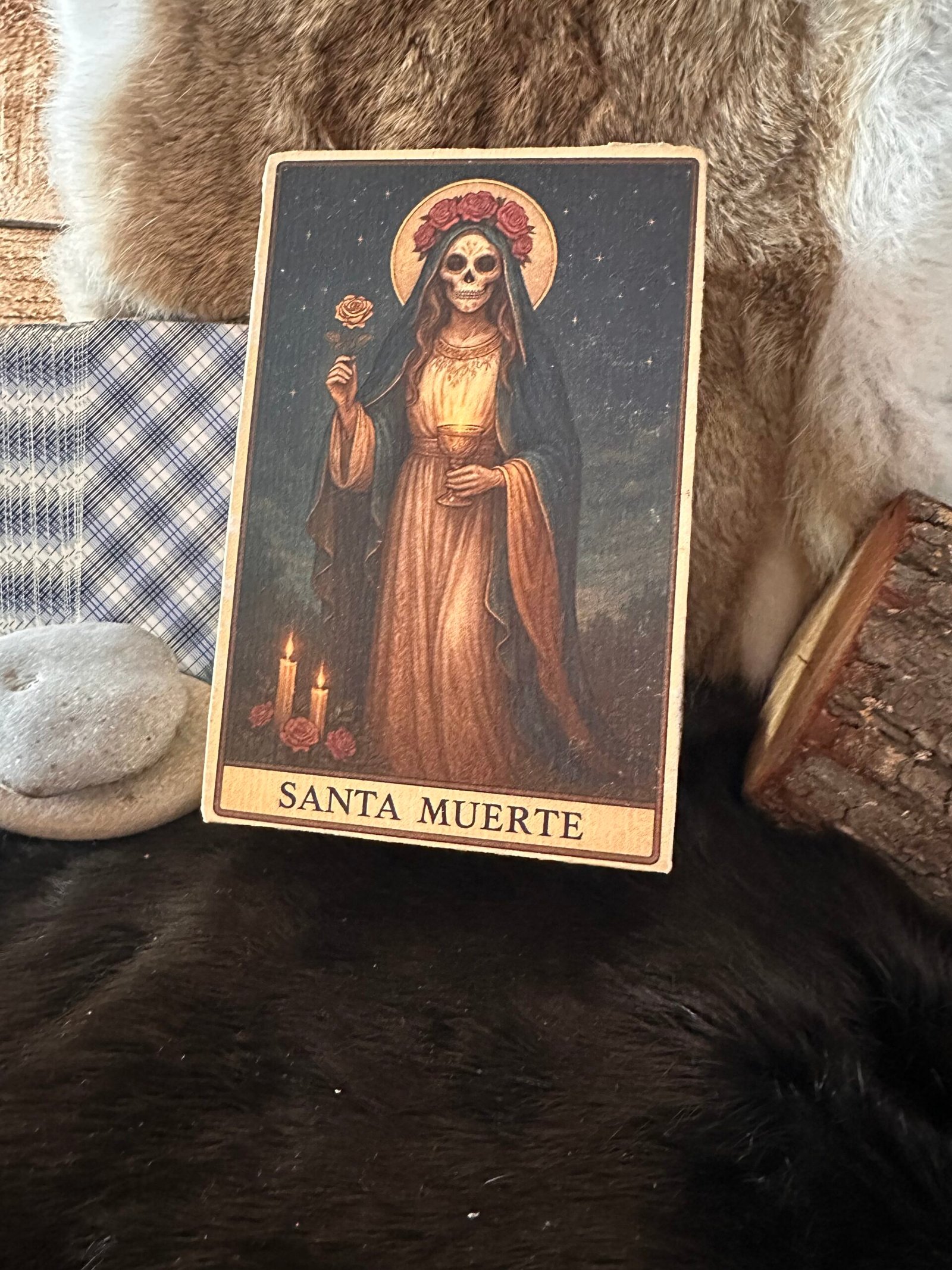 La Santa Muerte representa el cierre de ciclos, la protección en los tránsitos vitales y la aceptación de los procesos de transformación. Esta caja es ideal para barajas utilizadas en lecturas profundas, trabajos espirituales de cierre, protección personal y rituales de transición.