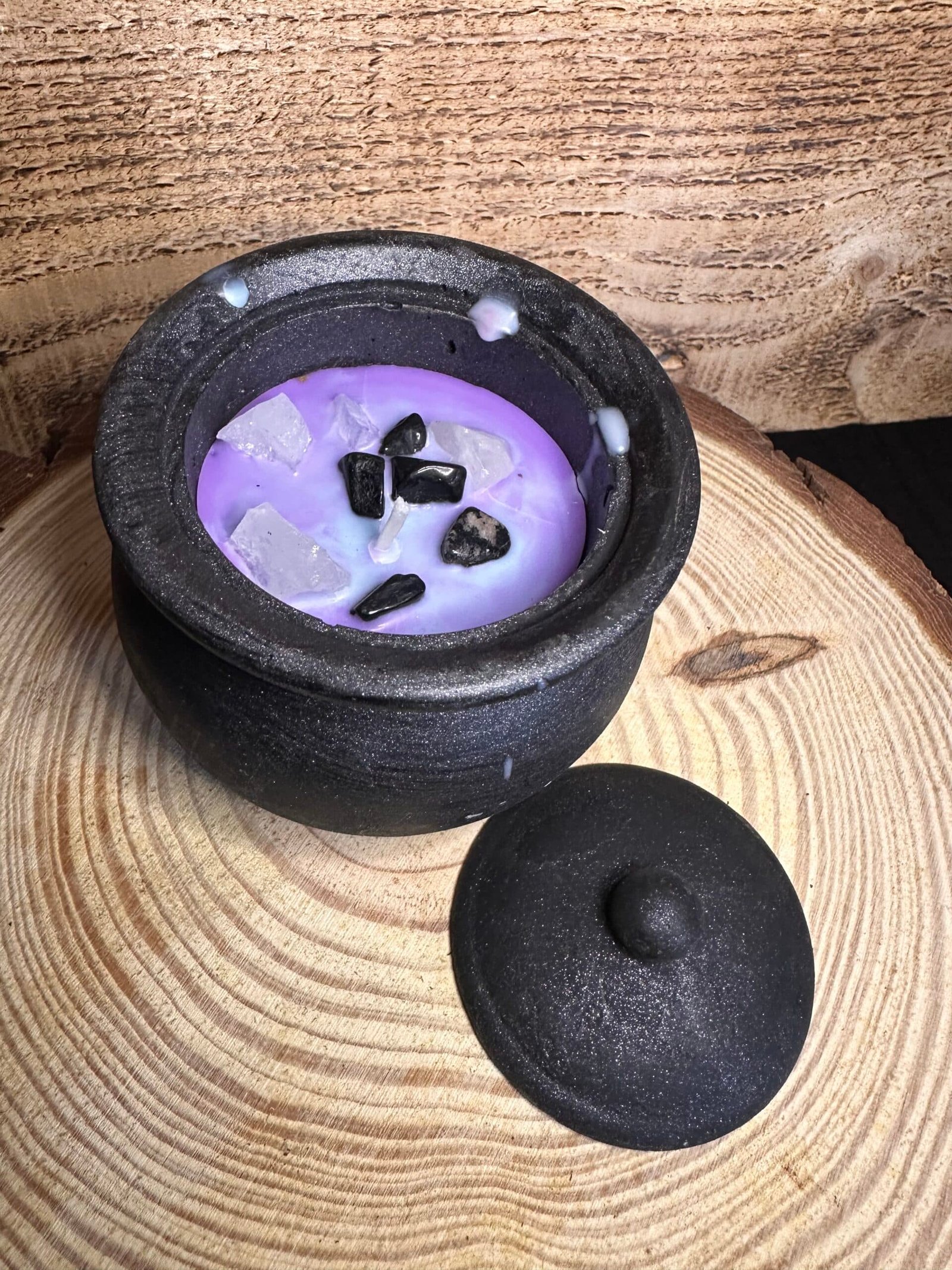 Caldero Artesanal con Vela Lila con Amatista y Turmalina
