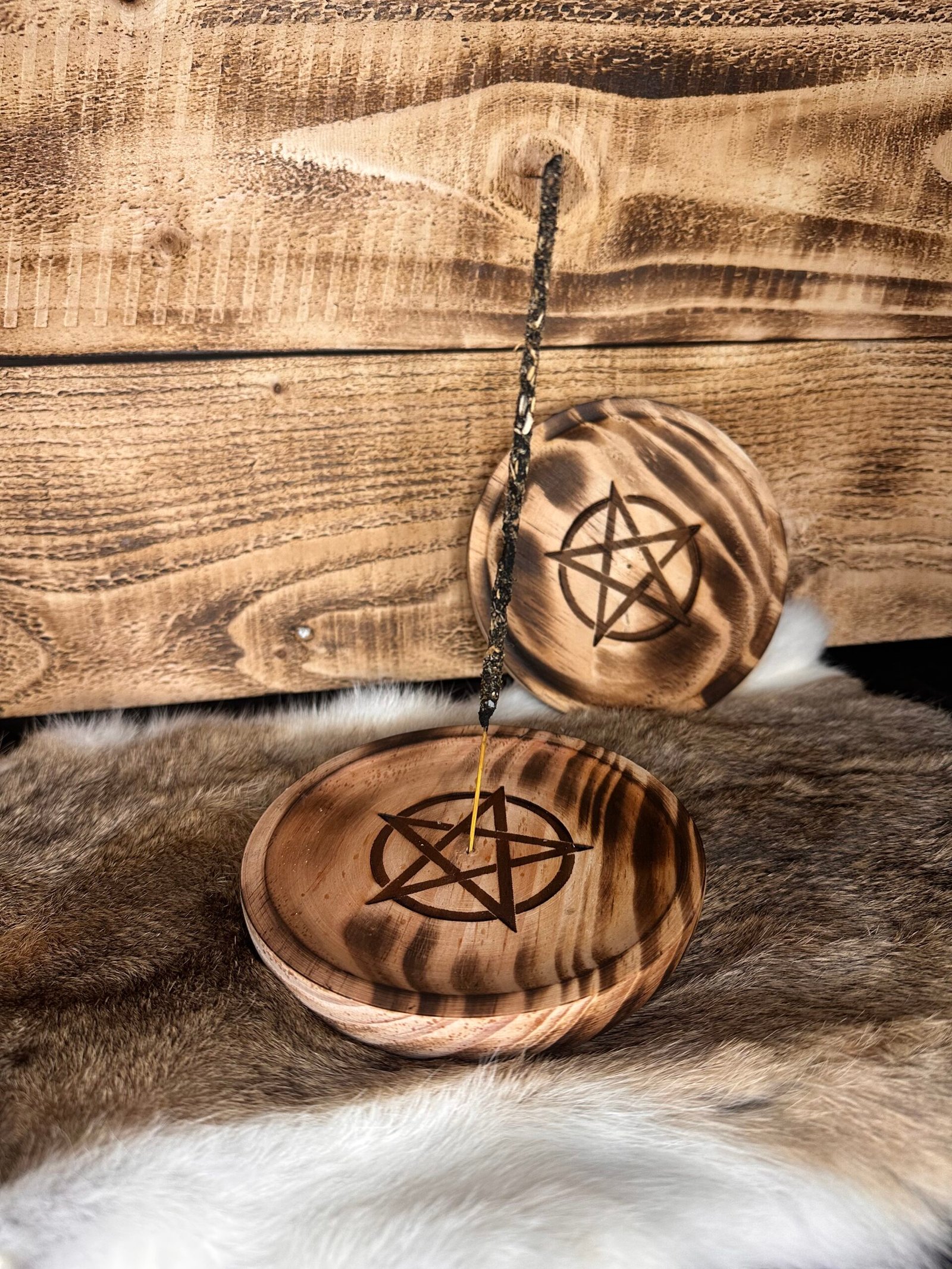 Este inciensario de madera redondo es una pieza artesanal diseñada para la quema de incienso y el trabajo energético consciente. En el centro lleva grabada una estrella de cinco puntas, símbolo ancestral de protección, equilibrio de los elementos y conexión espiritual.